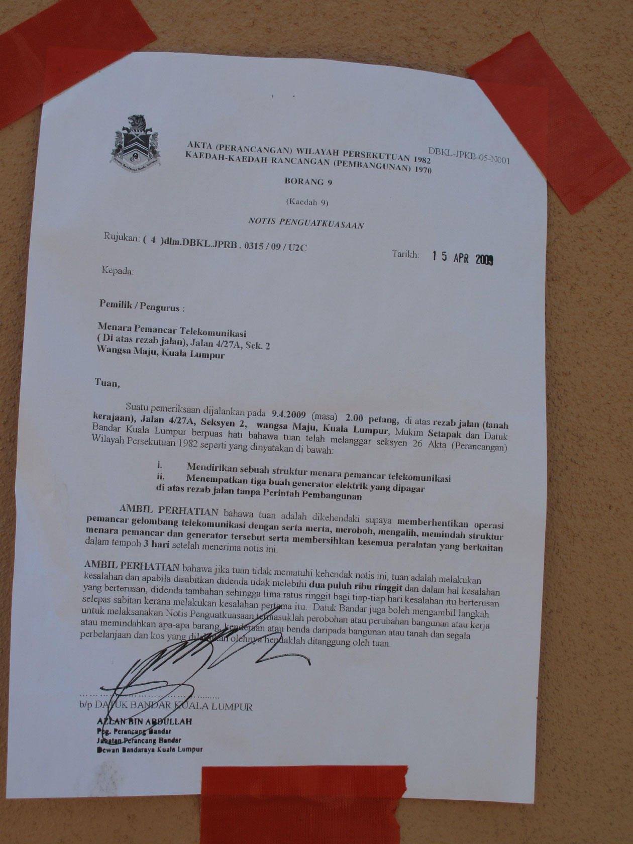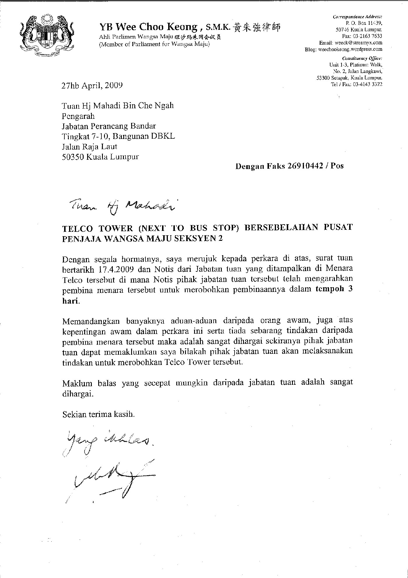 My letter to Jabatan Perancang Bandar, DBKL, asking when the telco tower will be demolished …