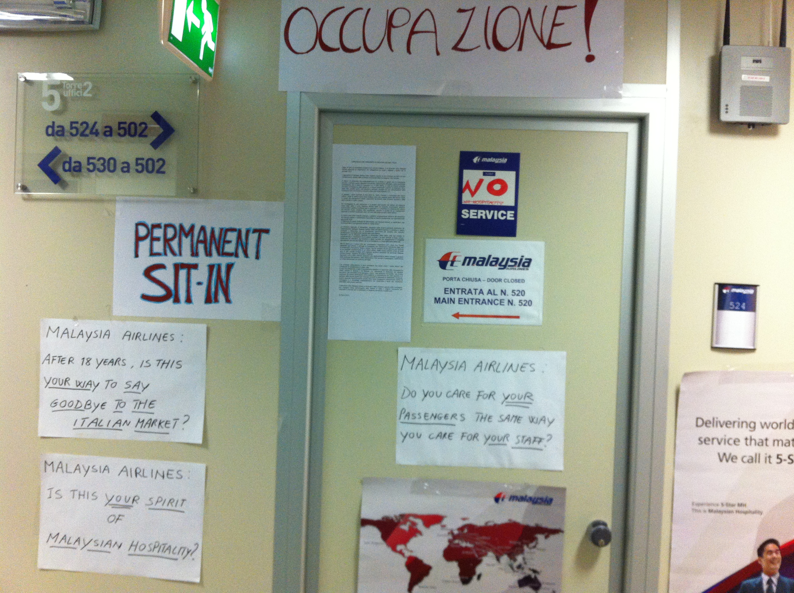 MAS office in Italy. There is a sit-in protest by MAS employees.