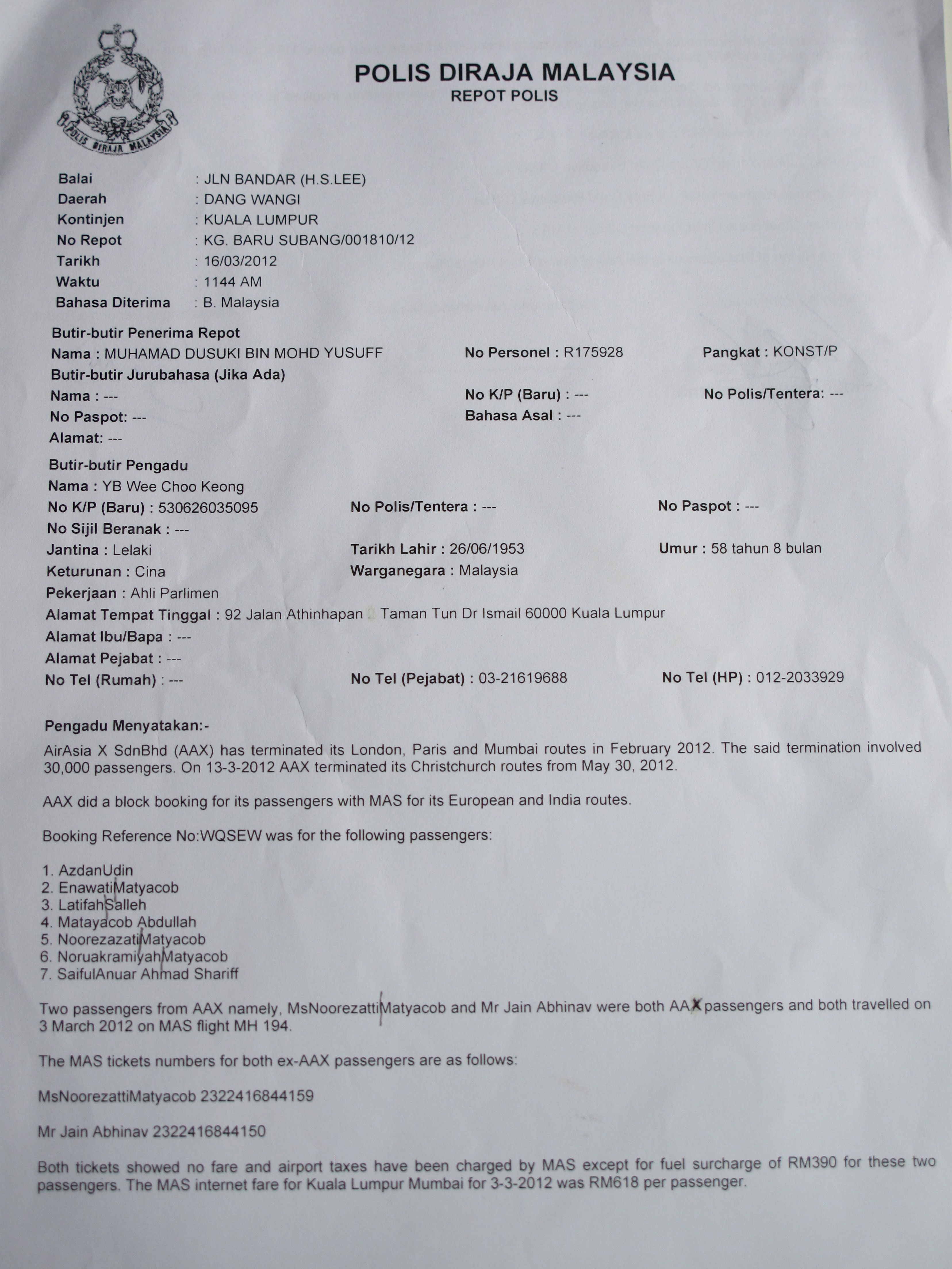 Updates @ 10:10 pm 17-3-2012:The police report on the “NO FARE” MAS ticket for the AirAsia X Sdn Bhd’s passengers has been reported in a news portal in HERE.