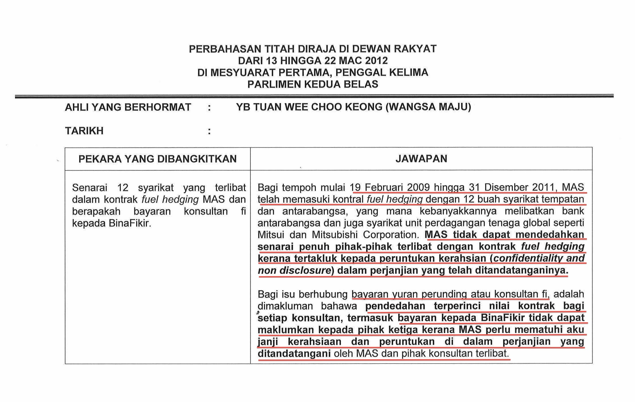 Yours truly has been pressing YB Senator Datuk Donald Lim, the Deputy Minister of Finance to fulfill his promise to Parliament that he will provide the information as to how much MAS paid BinaFikir Sdn Bhd for the WAU Project in 2002.