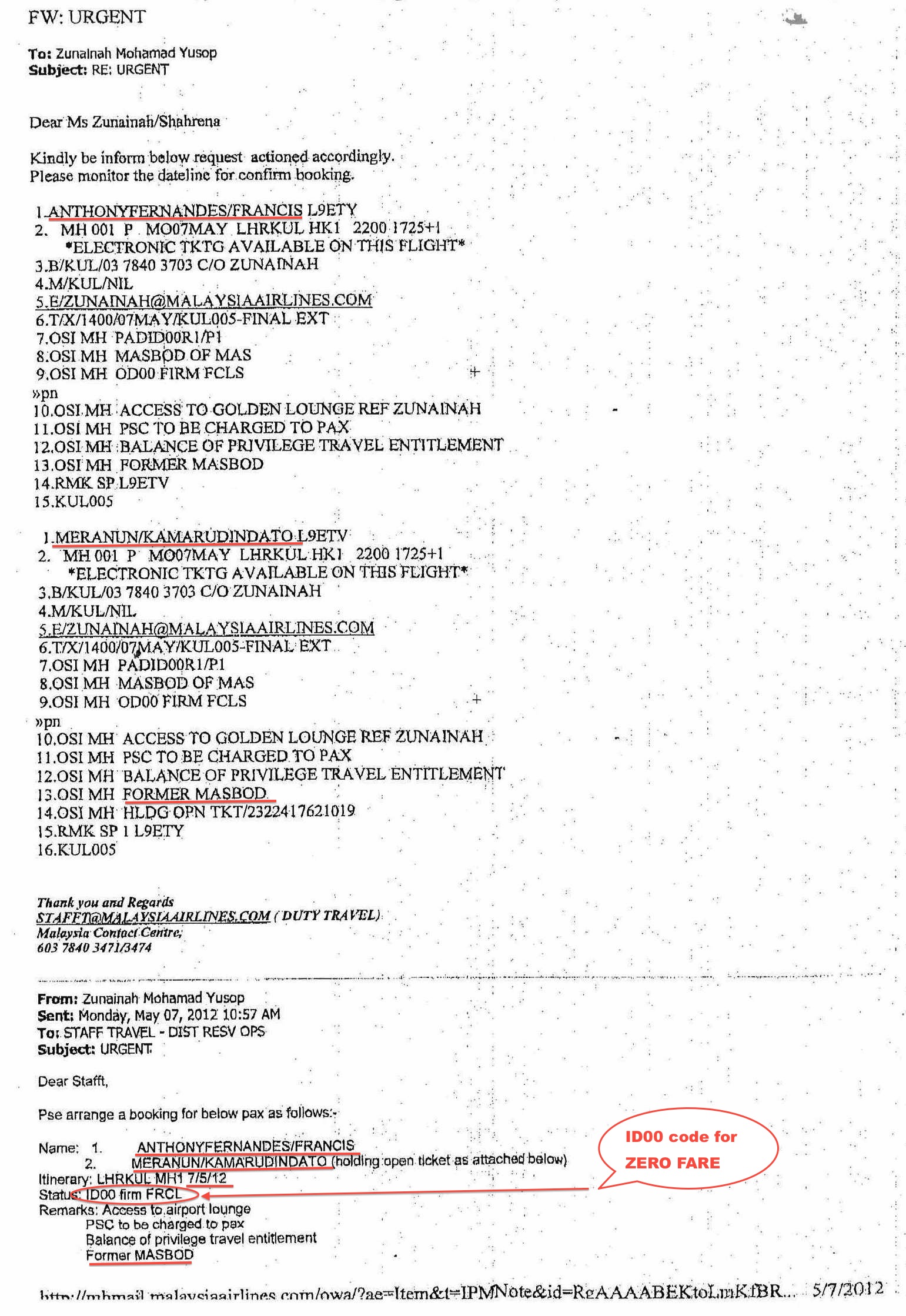 The Booking Request for free travel on 7-5-2012 for Tan Sri Tony Fernandes and Datuk Kamarudin Meranunfrom AirAsia, f of whom have resigned from the MAS Board on 2-5-2012 when the share swap was unwound