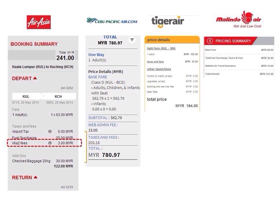 AirAsia imposes RM3.00 KLIA2 Airport Fees per passenger. Cebu Pacific Air, Tiger Air and Malindo Air do not charge such airport fees.